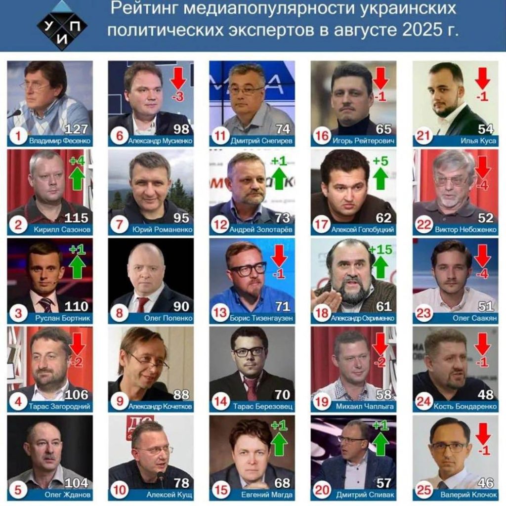 Політолог Олексій Голобуцький на своїй сторінці у Facebook вчергове оприлюднив рейтинг медіапопулярності політичних експертів Українського інституту політики. У рейтингу фігурують чимало людей, відомих своїми проросійськими меседжами, деякі з них перебувають під санкціями РНБО.