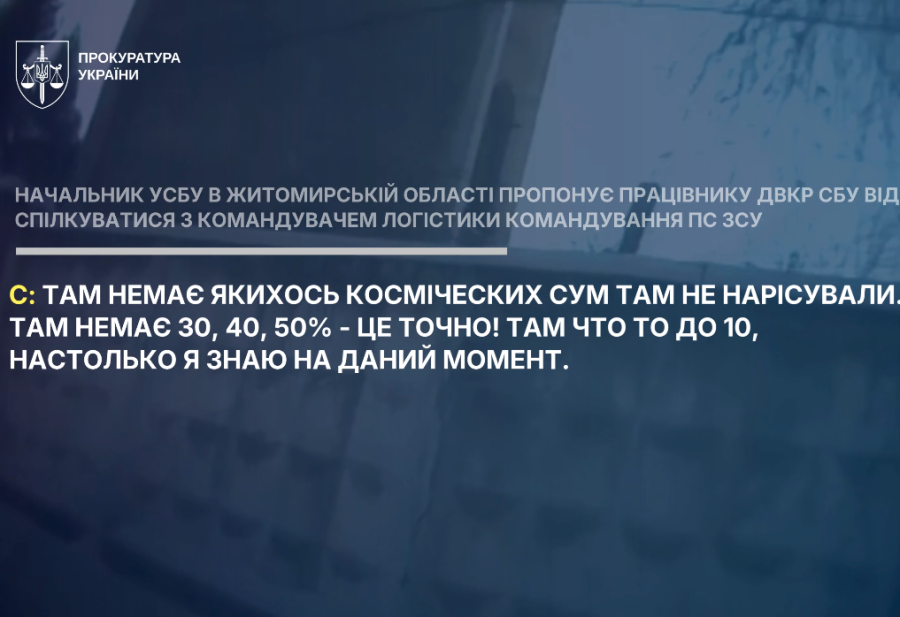Повідомлено про підозру командувачу логістики Командування Повітряних Сил ЗСУ та очільнику Управління Служби безпеки України у Житомирській області. Високопосадовці під час будівництва захисних конструкцій для літаків намагалися привласнити 13,8 млн грн та фальсифікувати результати аудиту. Сума договорів становила понад 1,4 млрд грн, а дії посадовців кваліфіковані як перевищення влади та пропозиція неправомірної вигоди в умовах воєнного стану.